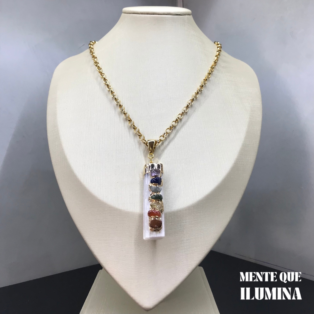 Colar folheado a ouro 18k com pingente em pedra Selenita, com outras sete pedras preciosas anexadas sobre ela, que ajudam a equilibrar todos os chakras do corpo, para harmonia energética e espiritual. Abaixo, deixamos a propriedade de cada uma delas.